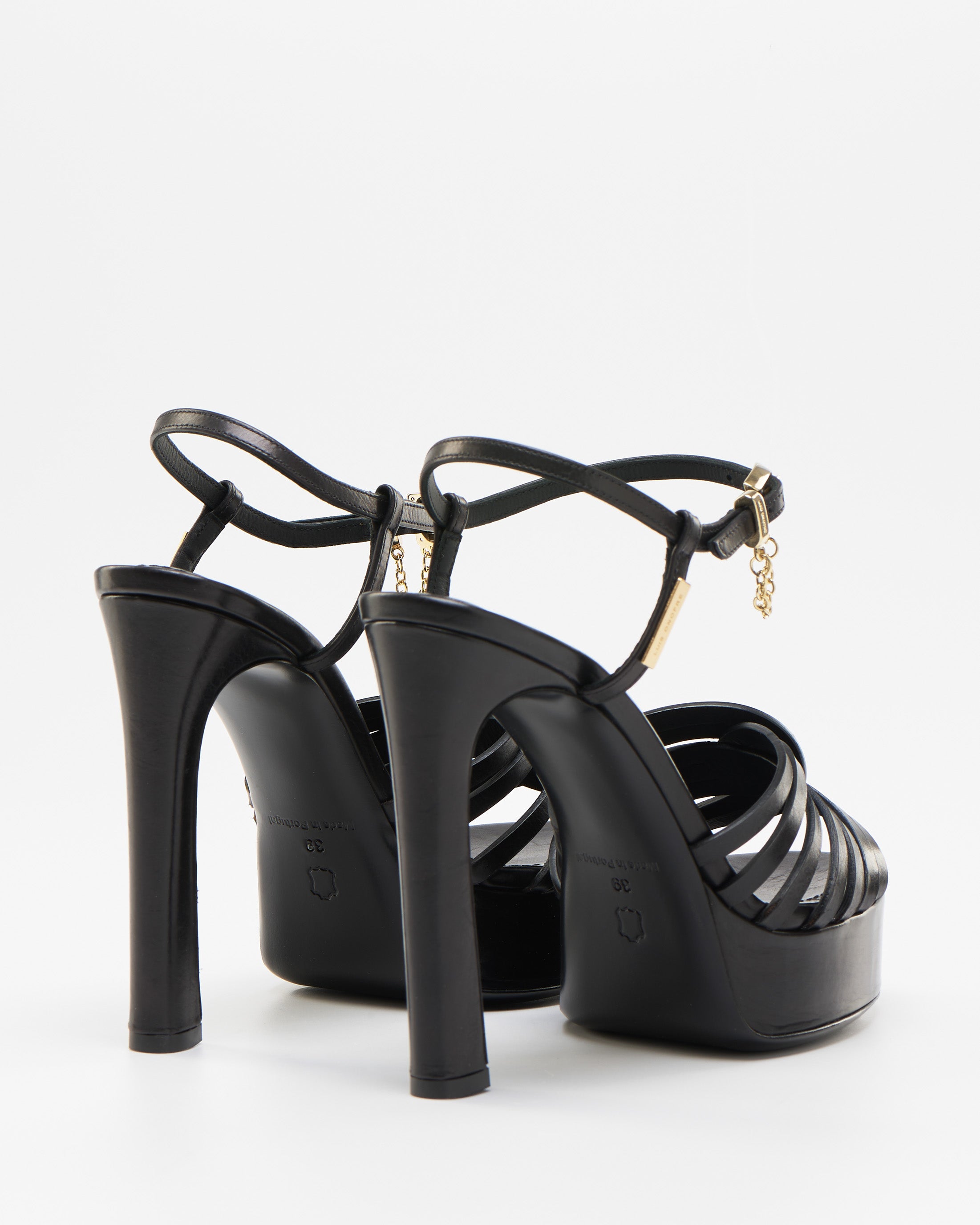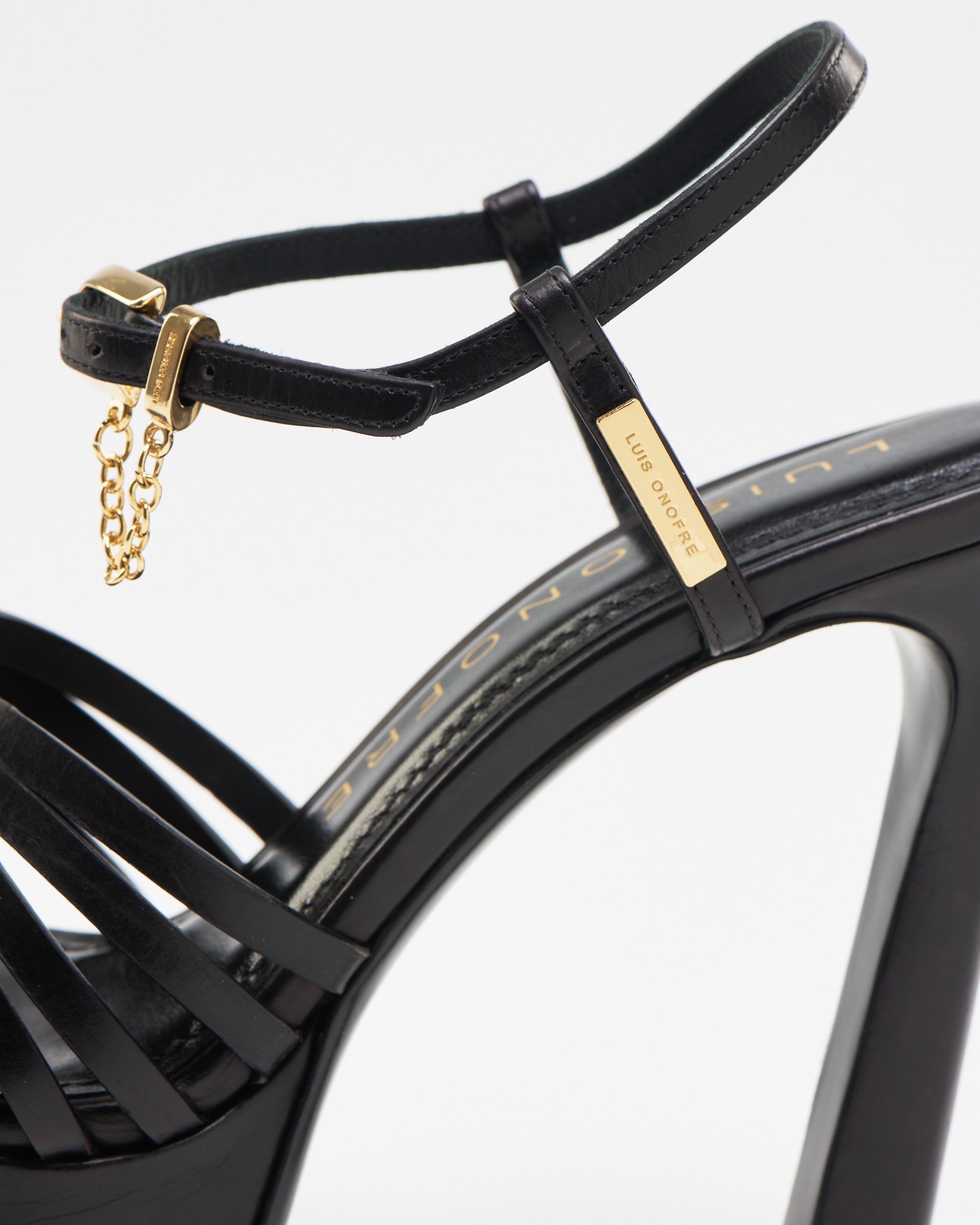 The sculptural high heel elongates the silhouette with bold elegance, while the ankle strap — adorned with a refined gold-tone metal detail and subtle chain — adds a touch of luminous sophistication.