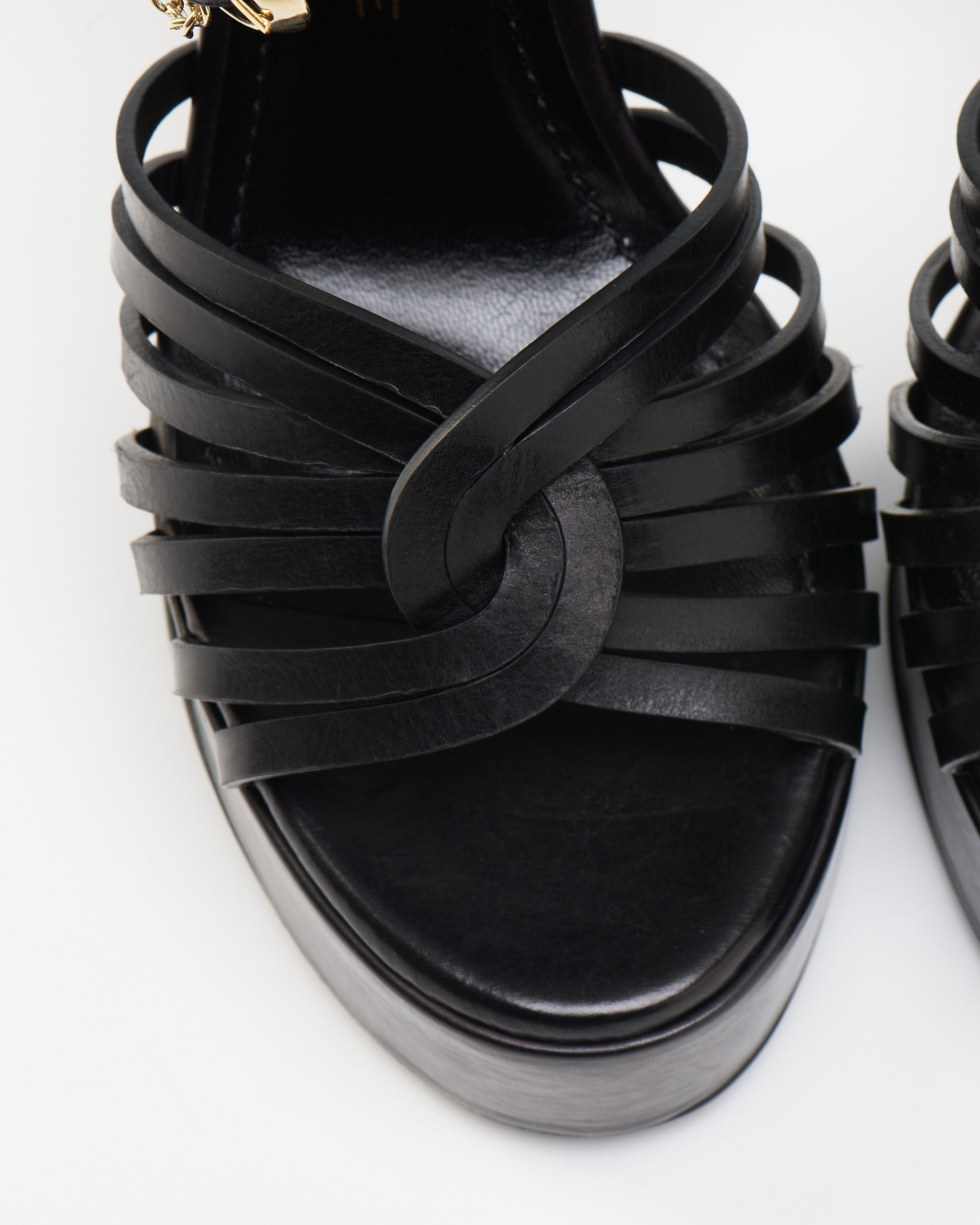 Meticulously crafted in Portugal from noble leather, these platform sandals embrace the foot with delicately interwoven straps that reveal and conceal in perfect balance.